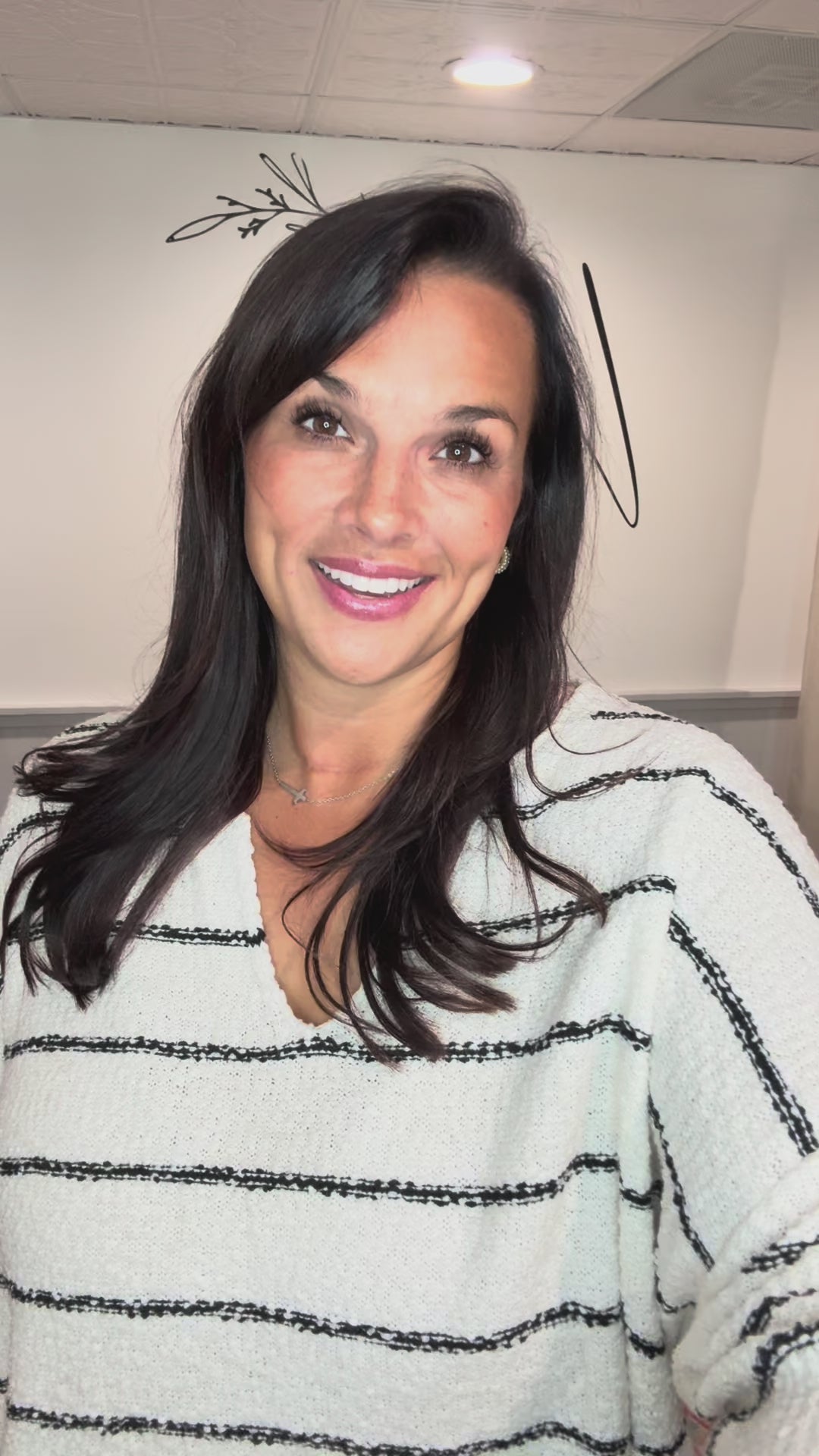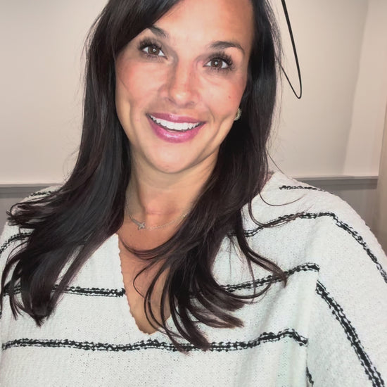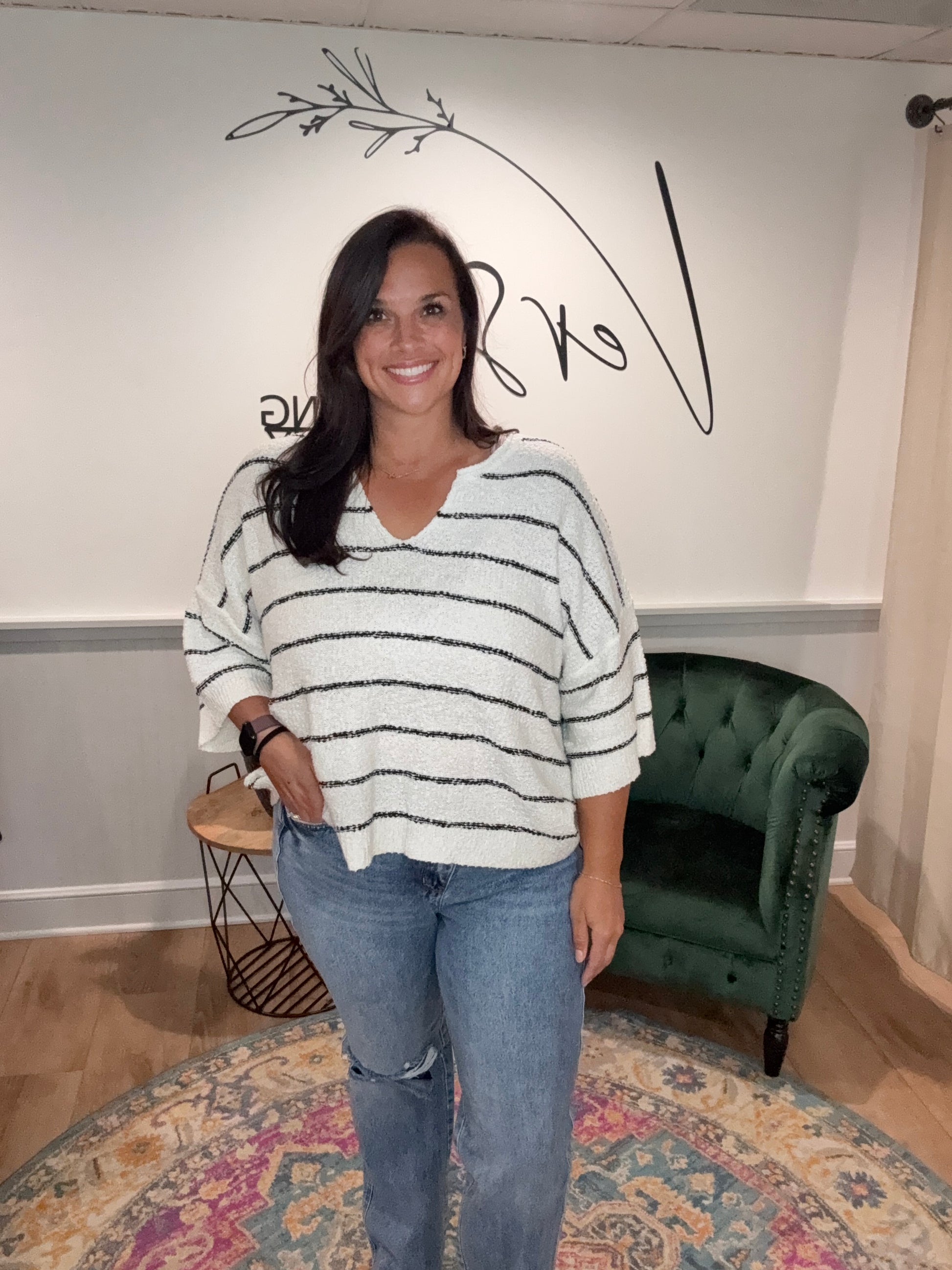 This lightweight sweater features a relaxed silhouette with classic black stripes on a soft cream knit. The V-neckline and drop-shoulder sleeves offer a laid-back, effortlessly chic vibe. Perfect for pairing with denim or layering on breezy days.