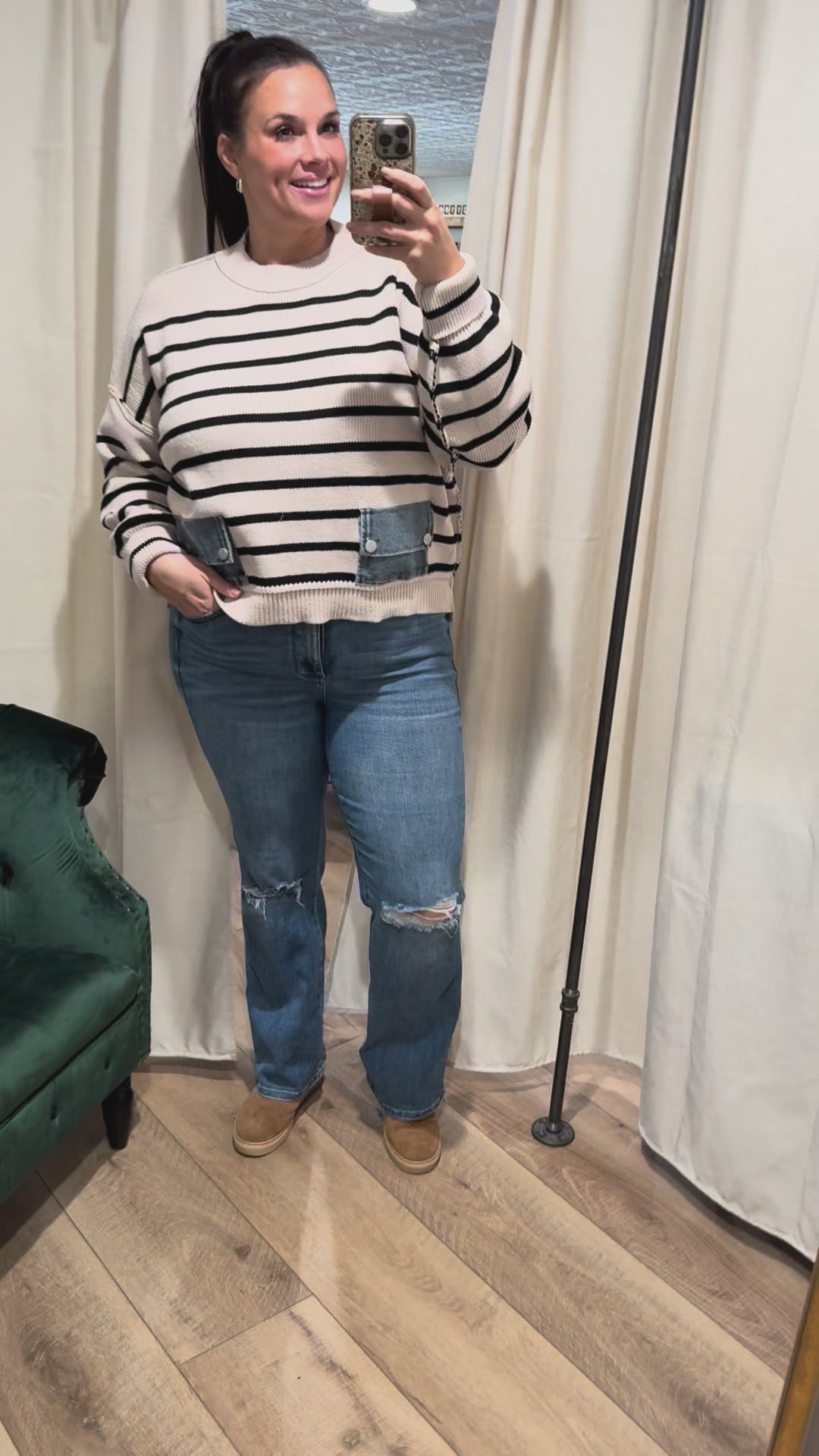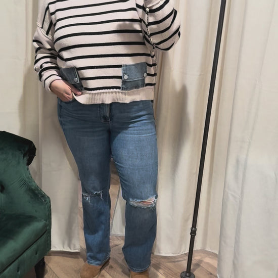 Ivory / Black Sweater with Denim Pockets