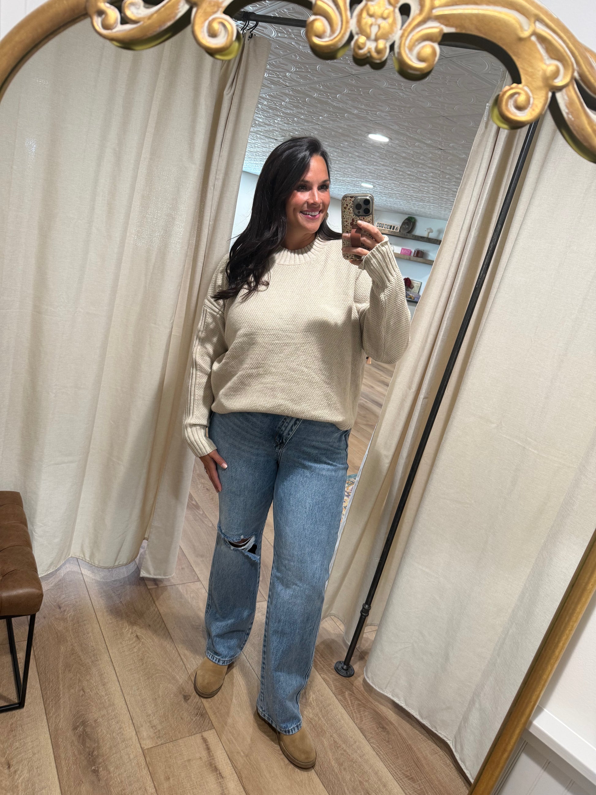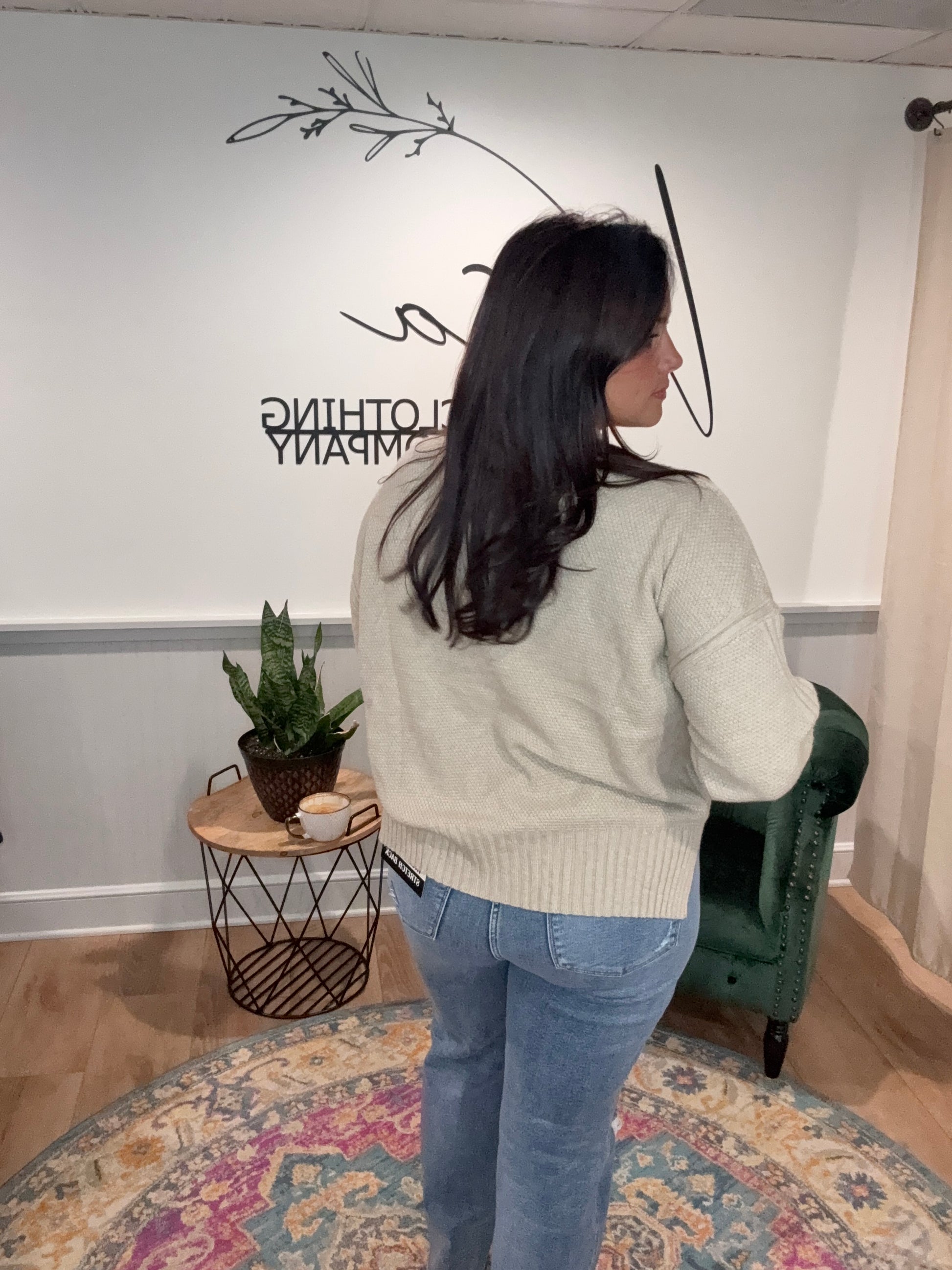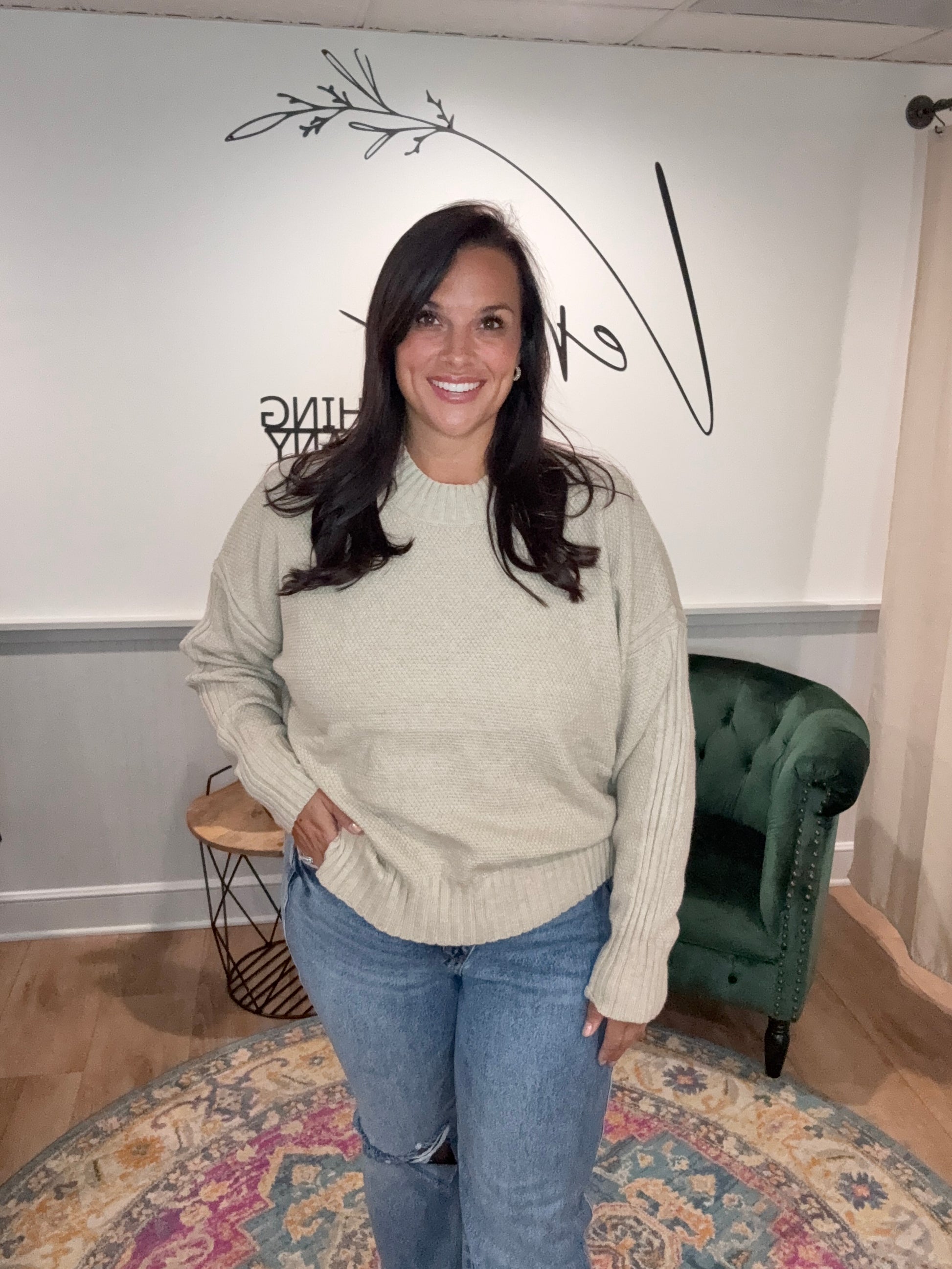 This cozy ivory sweater features a chunky knit texture with wide ribbed detailing along the hem, cuffs, and mock neck. Designed with a relaxed fit and side slits, it offers both warmth and movement. Perfect for layering on chilly days, it brings a timeless, effortlessly chic vibe to any outfit.